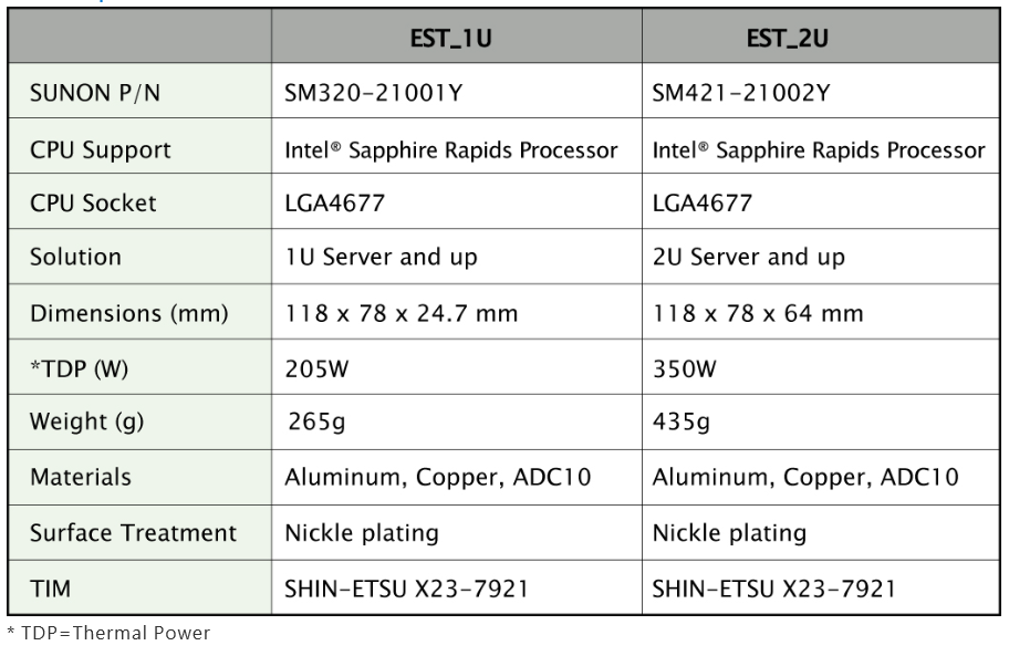 After the previous solutions for Intel’s Whitley Platform were launched last year, SUNON, in 2022, introduces EST_1U / EST_2U fan-less CPU Coolers exclusive to Intel® new-generation Eagle Stream Platform Sapphire Rapids Processor LGA 4677.