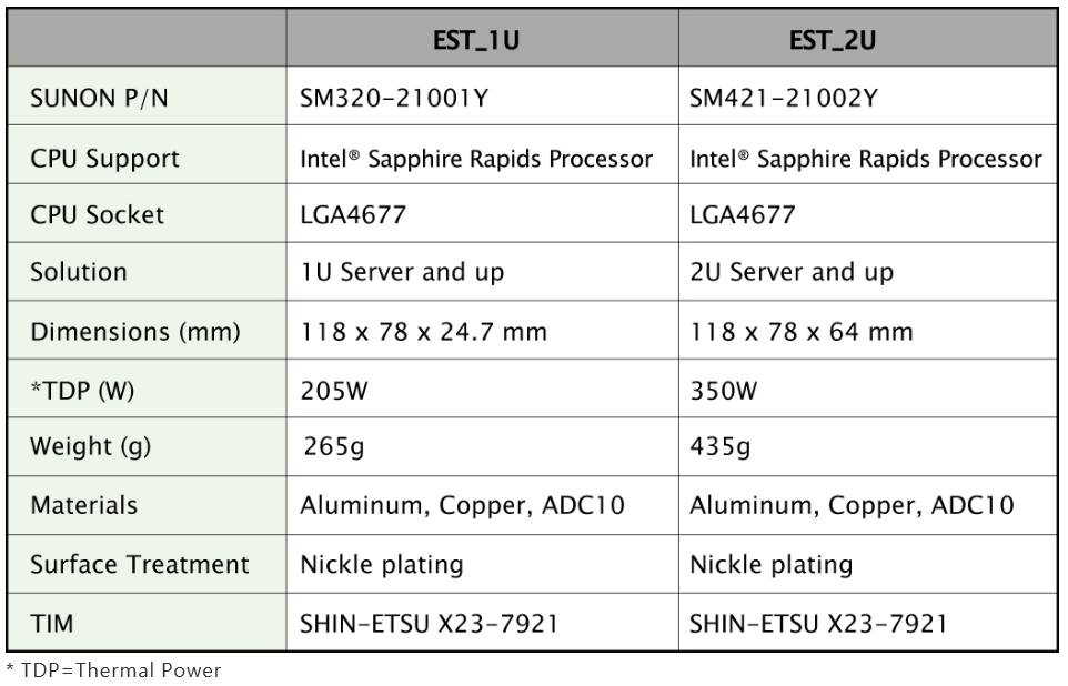 ● EST_1U,专为1U服务器打造,采用高导热的金属底座,内建高密度散热鳍片与热导管的特有设计,效能最高可解205W。