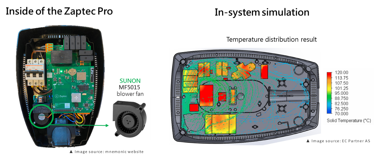 Zaptec是电动车充电解决方案的领导者,总部位于挪威,以创新性和人性化的壁挂式充电器而闻名。Zaptec的高效智能EV充电解决方案满足住宅和商用快充、慢充的多元需求,在电动车充电市场取得绝佳优势,成为挪威许多停车场和公寓大楼中最常见的电动车充电桩。EC PARTNER AS是建准在欧洲的经销商,长期与Zaptec密切合作,提供电子零组件和优化散热解决方案服务。建准研发团队透过流场仿真和温度分布分析,精准评估Zaptec Pro充电桩内部主要热源的散热风扇最佳位置,推荐静音且高效鼓风扇MF50151VX-1B00U-G99,薄型风扇设计能以最小的功耗提供最佳散热效果 同时降低充电桩能耗34W以上;此外,对于重视宁静生活的北欧地区,建准风扇的静音表现应用于住宅型充电系统更受到大众的喜爱。Zaptec Pro壁挂式充电设备与建准鼓风扇的完美组合提高充电效率、更安静、更安全性和长效使用寿命。