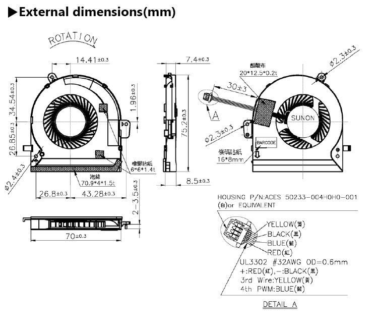 Rated Voltage:5 VDCOperating Current:450 mA(Max.)Operating Power Consumption:2.25 WATTS(Max.)Rated Speed:3500RPM ± 7%Acoustic Noise:38.7 dB(A)Air Flow:5.1 CFM/Min.4.6 CFM