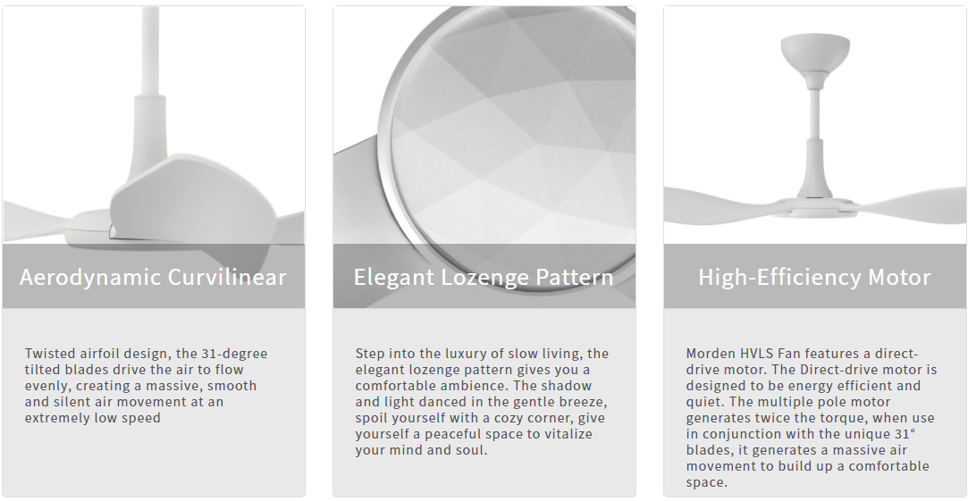 Modern HVLS Fan features a direct-drive BLDC motor which is designed to a quieter, high energy efficient operation. This multiple pole motor generates twice the torque, thus capable of driving a larger 31° blades, optimizing an air movement to the comfort of your space.