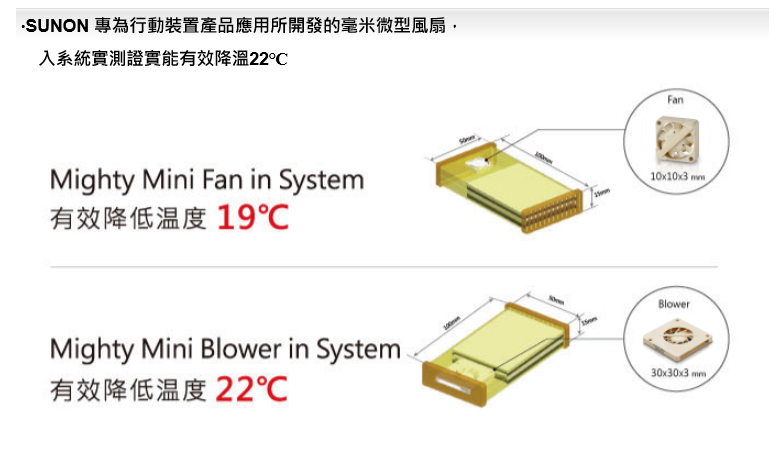 SUNON 為行動裝置產品打造量身訂做的散熱解決方案,讓散熱產品具備小型化、薄型化、低功耗、低震動、低噪音、高效能與長壽命等各項特性,迎合行動裝置產品輕、薄、小與長效電池續航力,並兼顧手持式手感與聲音品質要求,讓您的產品更具市場的競爭力。