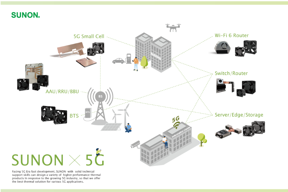 建準的全方位散熱解決方案與技術服務,可提供適用於5G基站聯網設備系統的最佳散熱方案,又CMSEM一條龍的方案設計服務,能為5G前終端的設備系統打造客製化散熱模組,不管是主動式散熱、被動式散熱、水冷散熱模組,均可靈活配置各種散熱元件,以提供體積小、高效的散熱方案。建準的無往不勝客製化服務流程和全方位散熱解決方案,與客戶共同營造智慧城市、萬物相連的巨量資料傳輸無延遲,提升通訊效率,邁向萬物互聯新未來世界。