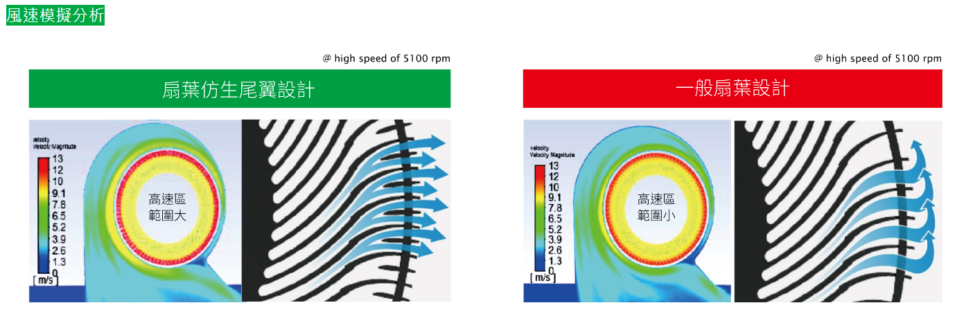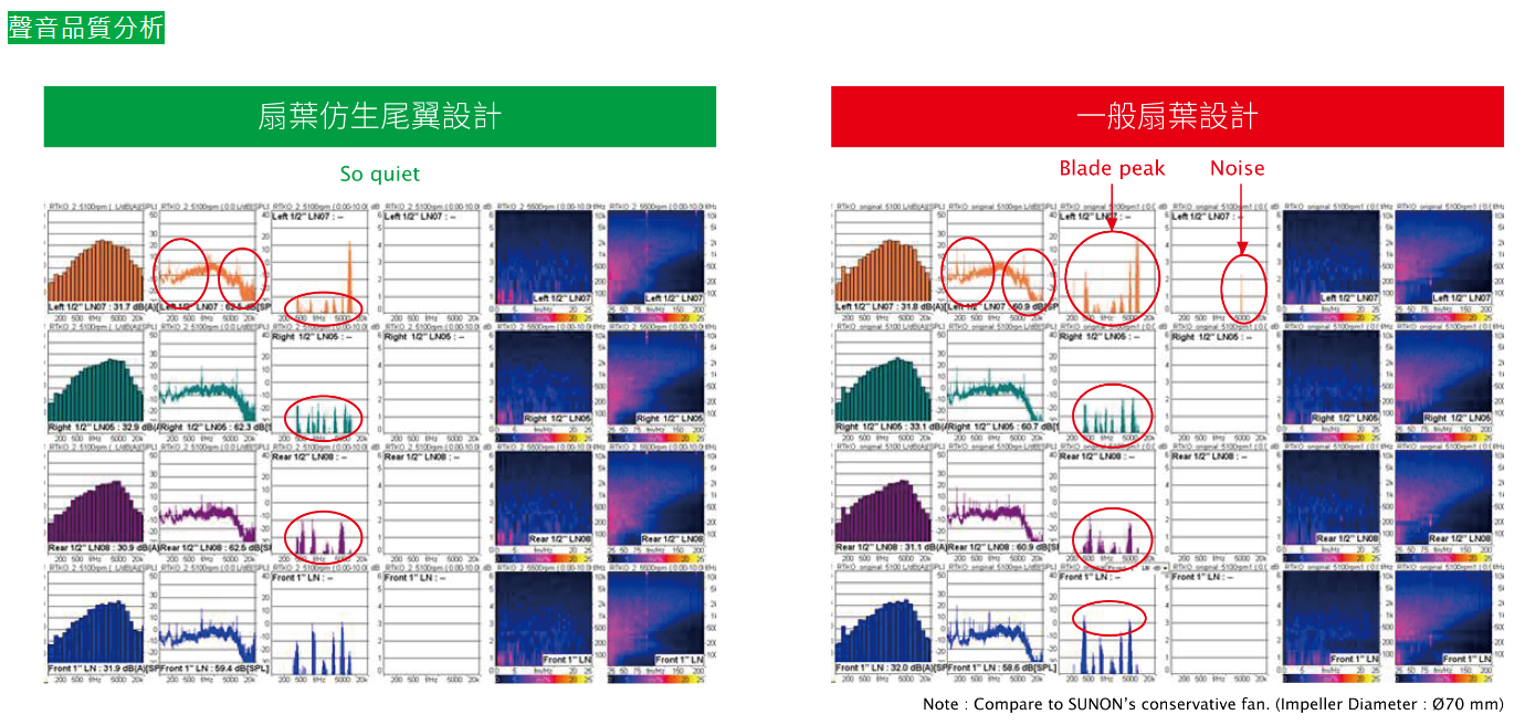建準渦輪扇葉間的尾翼設計,可改變氣流且有效增加氣流速度,從模擬流場分析圖中可見,建準仿生尾翼設計的渦輪扇的高速區範圍明顯較一般風扇設計的範圍大;同時,仿生尾翼設計可減少氣流間相互干擾現象,降低擾流所產生的噪音,透過聲音品質分析(如下圖),建準仿生尾翼渦輪扇在相同轉速下更安靜。