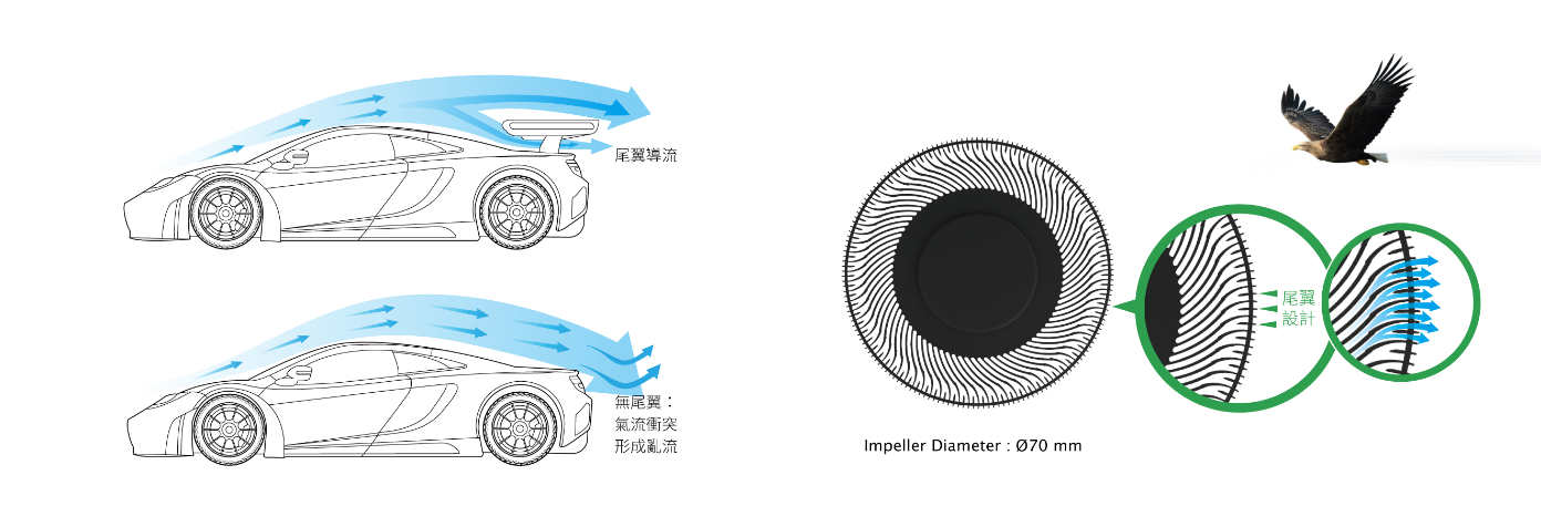 建準渦輪扇仿生尾翼設計靈感是來自鷹鳥飛行的尾羽。鳥類的翅膀是飛行的動力,羽尾則是控制飛行的舵,尾羽的形狀與結構決定鳥的飛行速度和靈活性。鳥類尾翼應用於生活科技中,以下圖汽車尾翼為例,當氣流流經尾翼後,尾翼改變了原本向下的氣流,根據力的相互作用原理,尾翼給了氣流向上的力,氣流給尾翼施加了一個向下的力,讓氣流更順暢,讓車體能平穩的高速行駛。