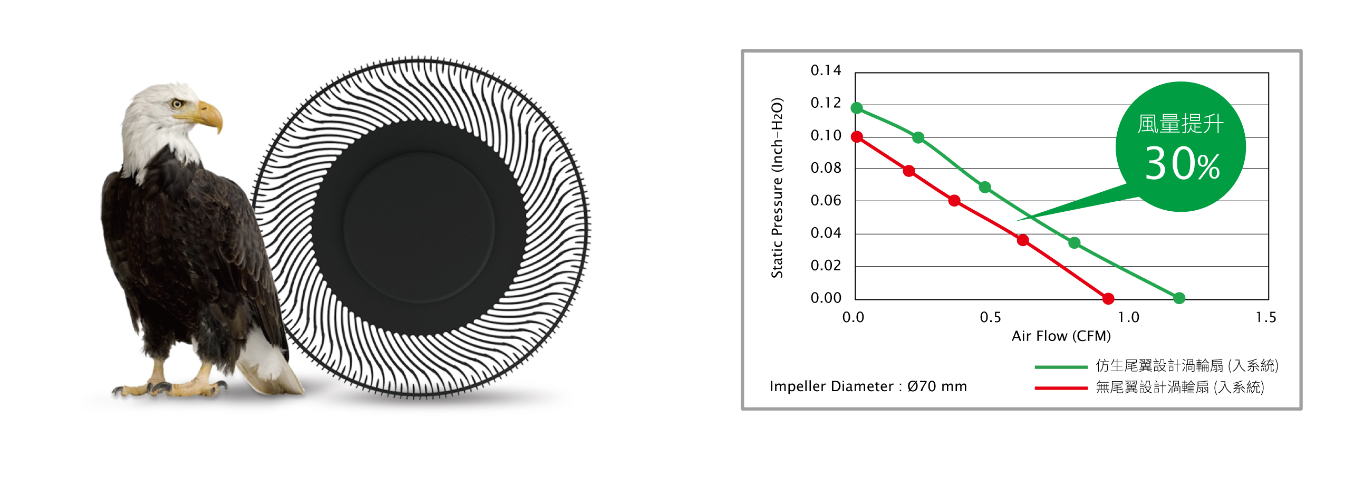 建準薄型渦輪扇系列導入專利仿生尾翼設計,增加風速、控制風流方向,讓超薄風扇發揮最大效能。建準渦輪扇葉仿生尾翼設計,靈感來自鷹鳥飛行的尾羽;鳥類的翅膀是飛行的動力,羽尾則是控制飛行的舵,鳥類尾羽的形狀與結構決定鳥的飛行速度和靈活性,建準在超薄渦輪扇葉末端導入尾翼設計,透過尾翼片控制渦輪扇運轉時的氣流方向,同時消彌扇葉末端常見的渦流現象,讓風扇氣流更順暢,達到提高風速與將渦流低噪音的效果。以渦輪扇葉尺寸Ø 70 mm的風扇為例,導入仿生尾翼設計,控制在相同噪音,風量可提高30%,為超薄筆電提供最強大的散熱效果。