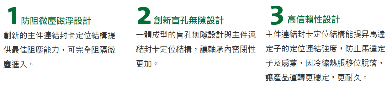 建準應用MagLev新科技,搭配微塵阻隔技術,結合密閉封卡定位設計,再經近8年來的驗證,在2009年推出此系列: DR MagLev (Dust-Resistance MagLev )防阻微塵磁浮馬達風扇。可防止馬達定子扇葉移位脫落、絕佳阻隔微塵效果、更高信賴性、更長壽命的優勢。