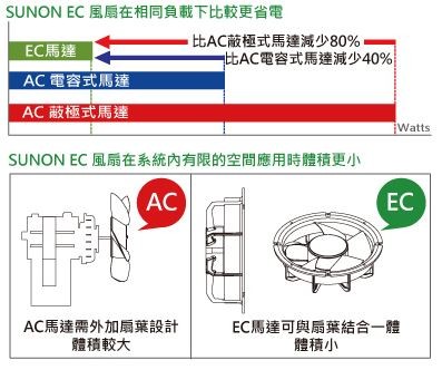 EC(Electronic Commutation電子換向)結合交流轉直流電壓轉換器之直流馬達,可直接應用於交流電源輸入,並擁有直流馬達節能與轉速控制等優勢。