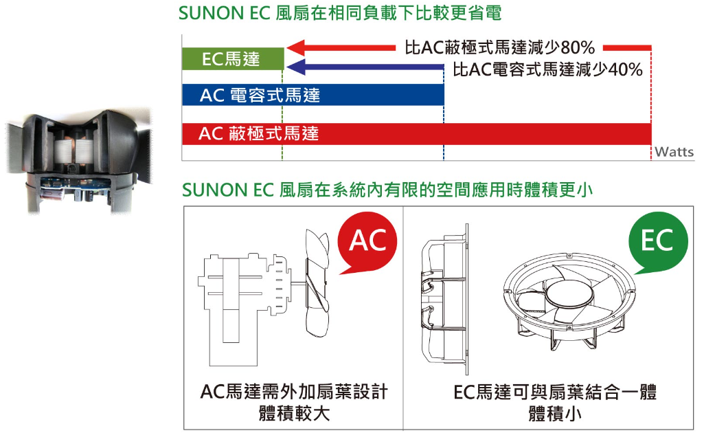 EC (Electronic Commutation電子換向) 結合交流轉直流電壓轉換器之直流馬達,可直接應用於交流電源輸入,並擁有直流馬達節能與轉速控制等優勢。