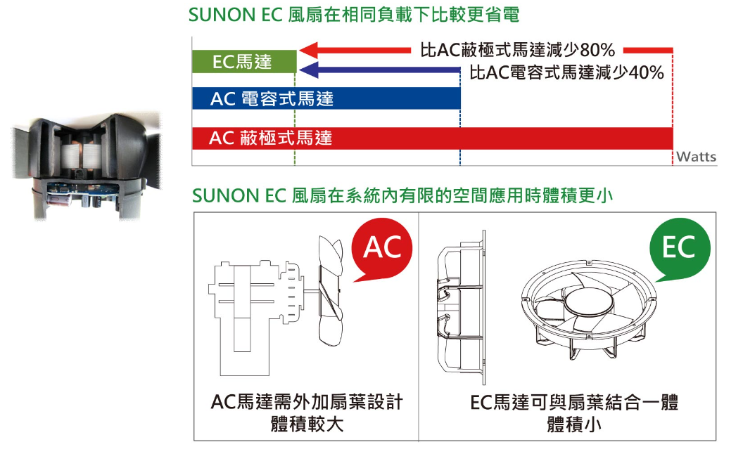 EC (Electronic Commutation電子換向) 結合交流轉直流電壓轉換器之直流馬達,可直接應用於交流電源輸入,並擁有直流馬達節能與轉速控制等優勢。