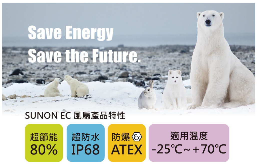 SUNON高效節能 EC風扇將DC風扇馬達及轉速控制功能,直接應用於交流電源輸入環境。EC 高效率節能馬達較一般AC馬達省電80%以上,並可依客戶需求提供IP21、IP56、IP68 與 ATEX 防爆防護,保障產品長效使用與安全。#EC FAN