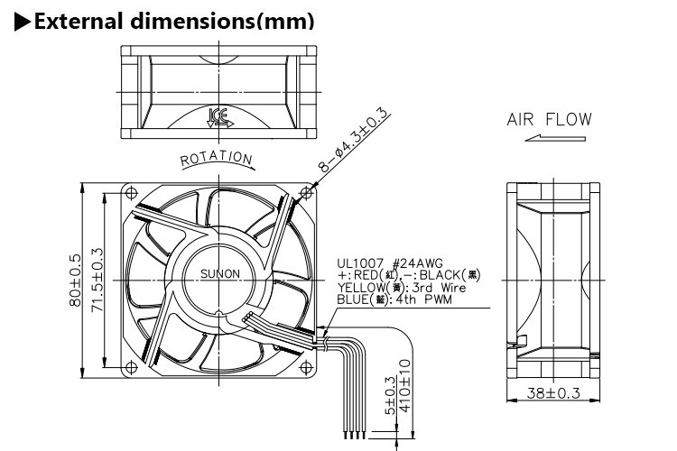 Rated Voltage:12 VDCRated Current:1050 mARated Power :12.60 WATTSRated Speed:6500RPM ± 10%Acoustic Noise:56.4 dB(A)Air Flow:91 CFM