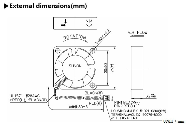 Rated Voltage:5 VDCRated Current:115 mA/Max.133mARated Power :0.58 WATTS/Max.0.67 WATTSRated Speed:13000RPM ± 20%Acoustic Noise:31 dB(A) Air Flow:3.0 CFM