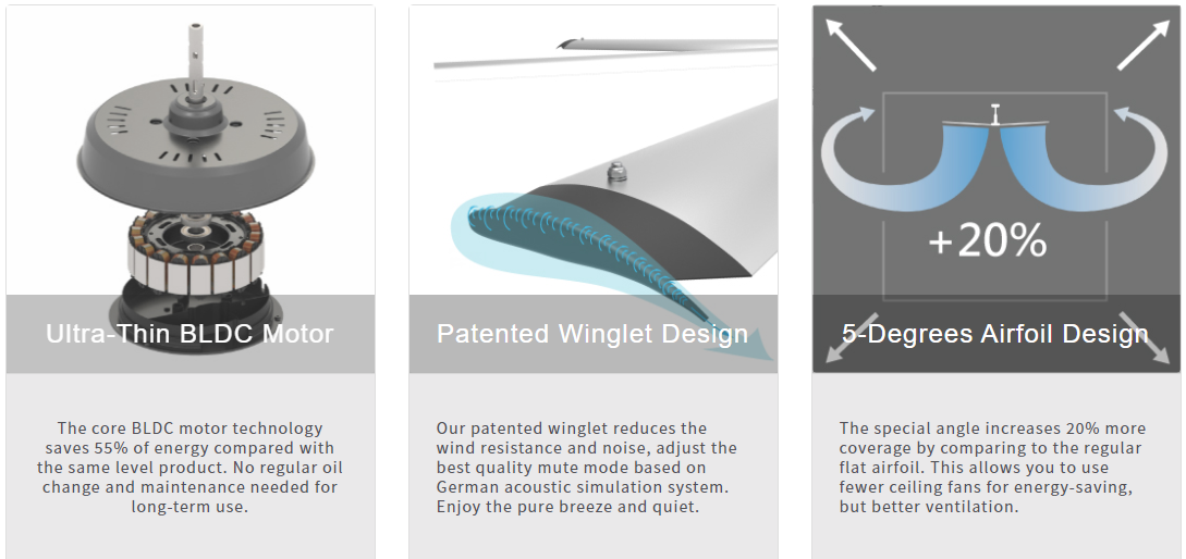series 3 has patented silent winglet with aircraft-grade aluminum and 5 degrees angle airfoil, it can eliminate the wind noise from the tail end of airfoil effectively, enlarge the air coverage area more than 20%, and provide incredibly silent and comfortable air movement to space such as workshop, ranch, warehouse, and service center.
