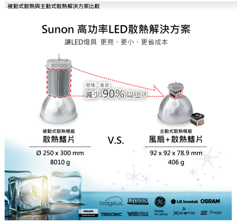 在LED 燈零組件中,電源零件是最容易因高溫而提早損壞,一般電子元件如電解電容當環境溫度增加 10℃,壽命會減少一半,反過來說,如降低 10℃ 則壽命會增加一倍。SUNON 散熱模組搭配獨特流道設計可將風流導向電源零件部位,達到降低內部零件溫度,可有效提昇LED燈使用壽命。