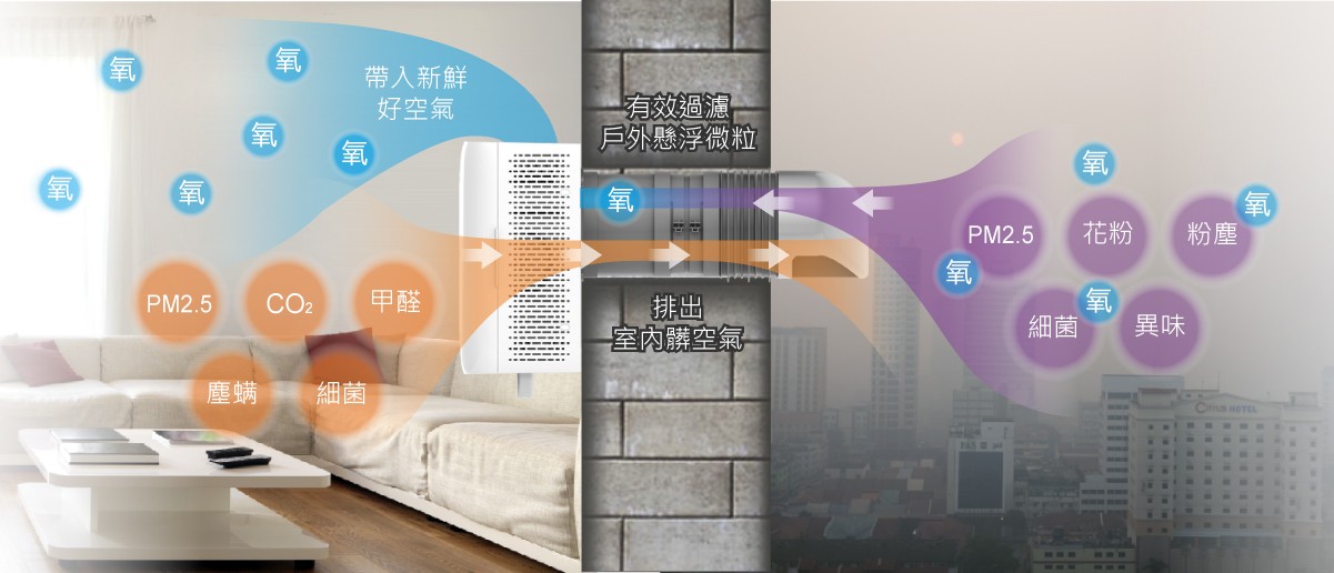 面對日益嚴重的空氣污染和霧霾,建準位居家打造出讓家會呼吸的雙流新風機,以活氧、清淨和健康為產品設計概念,幫助居家進行室內外空氣交換,透過PM2.5 高效率網過濾戶外空氣為居家注入新鮮活氧,給您家一個乾淨健康的環境。