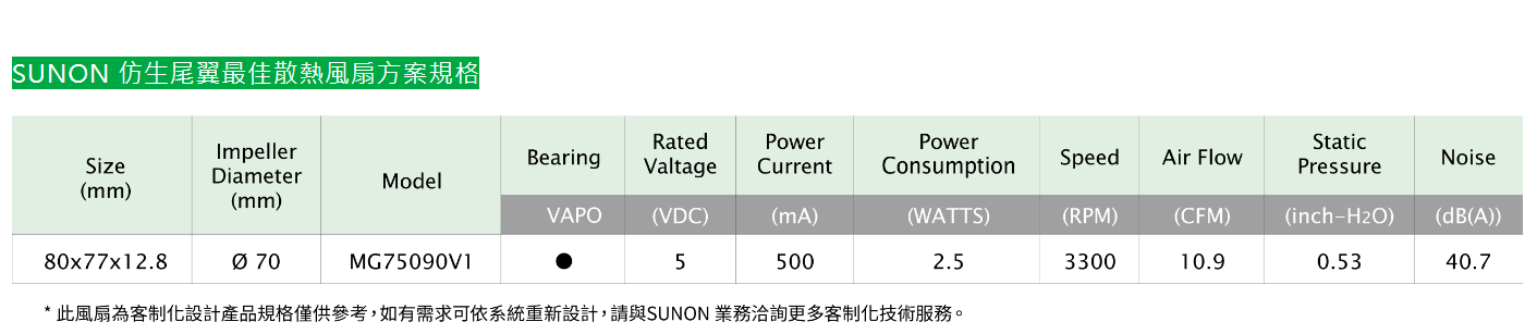 建準薄型渦輪扇系列導入專利仿生尾翼設計,增加風速、控制風流方向,讓超薄風扇發揮最大效能。建準渦輪扇葉仿生尾翼設計,靈感來自鷹鳥飛行的尾羽;鳥類的翅膀是飛行的動力,羽尾則是控制飛行的舵,鳥類尾羽的形狀與結構決定鳥的飛行速度和靈活性,建準在超薄渦輪扇葉末端導入尾翼設計,透過尾翼片控制渦輪扇運轉時的氣流方向,同時消彌扇葉末端常見的渦流現象,讓風扇氣流更順暢,達到提高風速與將渦流低噪音的效果。以渦輪扇葉尺寸Ø 70 mm的風扇為例,導入仿生尾翼設計,控制在相同噪音,風量可提高30%,為超薄筆電提供最強大的散熱效果。