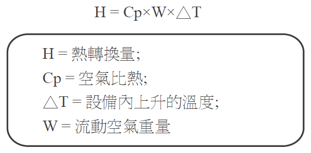 如果已知系統設備內部散熱量與允許的總溫度上升量,可得到冷卻設備所需的風量。以下為基本的熱轉換方程式: