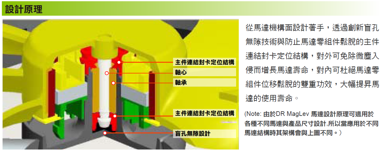 建準應用MagLev新科技,搭配微塵阻隔技術,結合密閉封卡定位設計,再經近8年來的驗證,在2009年推出此系列: DR MagLev (Dust-Resistance MagLev )防阻微塵磁浮馬達風扇。可防止馬達定子扇葉移位脫落、絕佳阻隔微塵效果、更高信賴性、更長壽命的優勢。