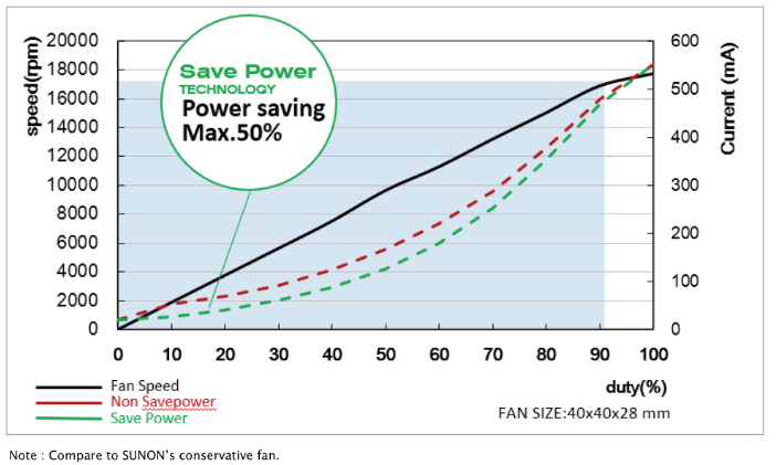 建準 Save Power 省電回路技術,可以在當風扇轉速下降時,仍控制馬達維持在最高的轉換效率以達到耗能減少的效果,可以比一般PWM FAN 更省電,最多可再省 50% 的能耗,達到最佳節能狀態。